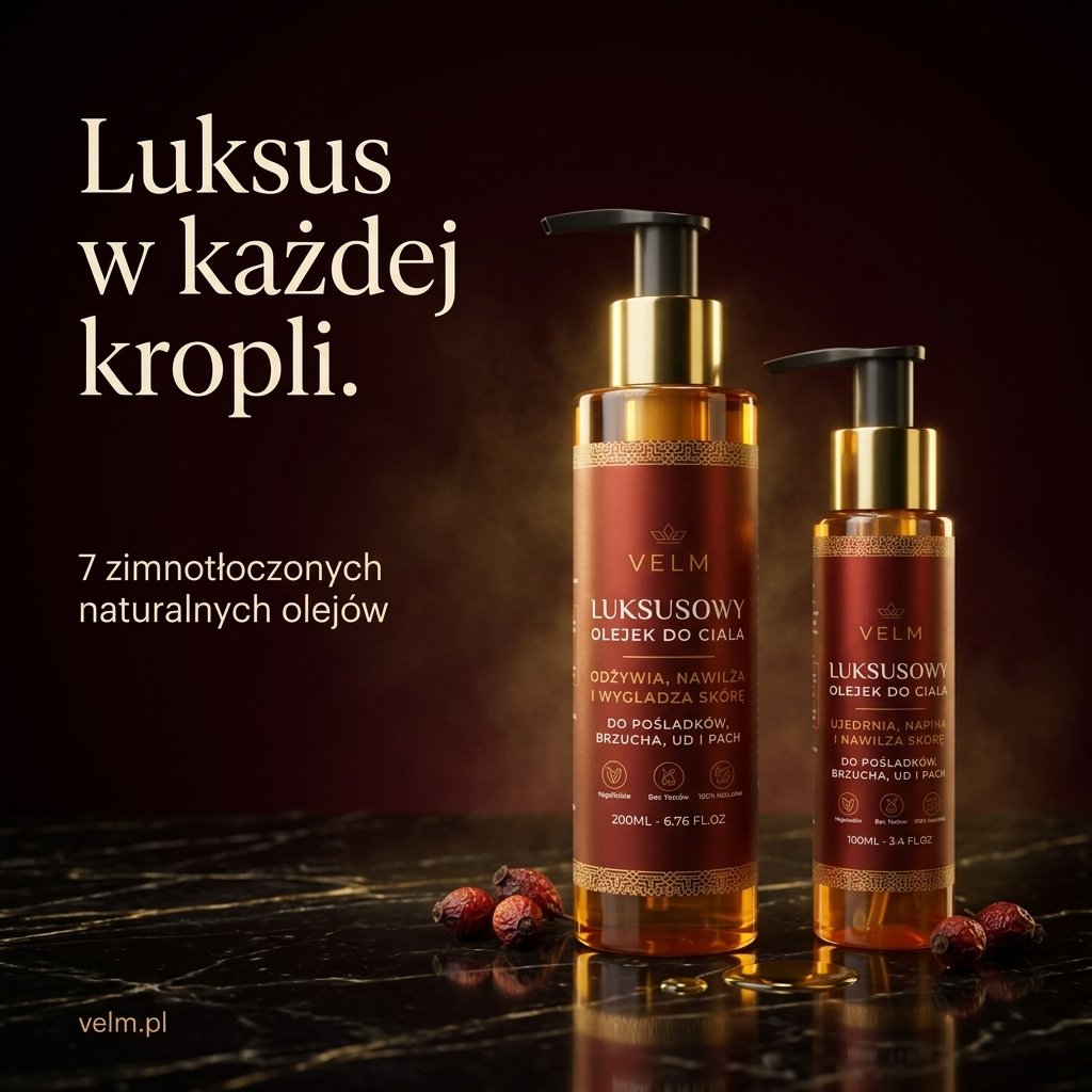 Poznaj VELM™ – luksusowy olejek, który intensywnie nawilża, wygładza i przywraca skórze naturalną jędrność.